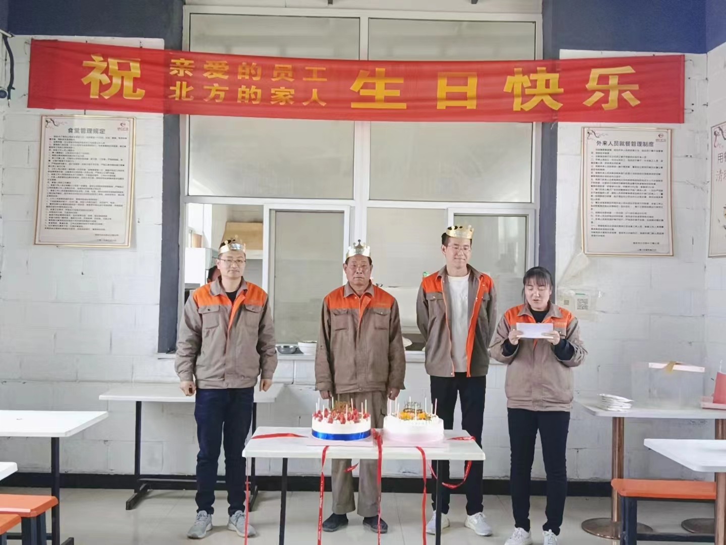 公司食堂準(zhǔn)備了豐盛可口的飯菜,公司準(zhǔn)備了生日蛋糕,董事長發(fā)表講話,并為過生日的同志送上生日祝福,公司員工聚在一起唱生日歌,分享生日蛋糕。大家都覺得十分幸福,因為我們是相親相愛一家人
